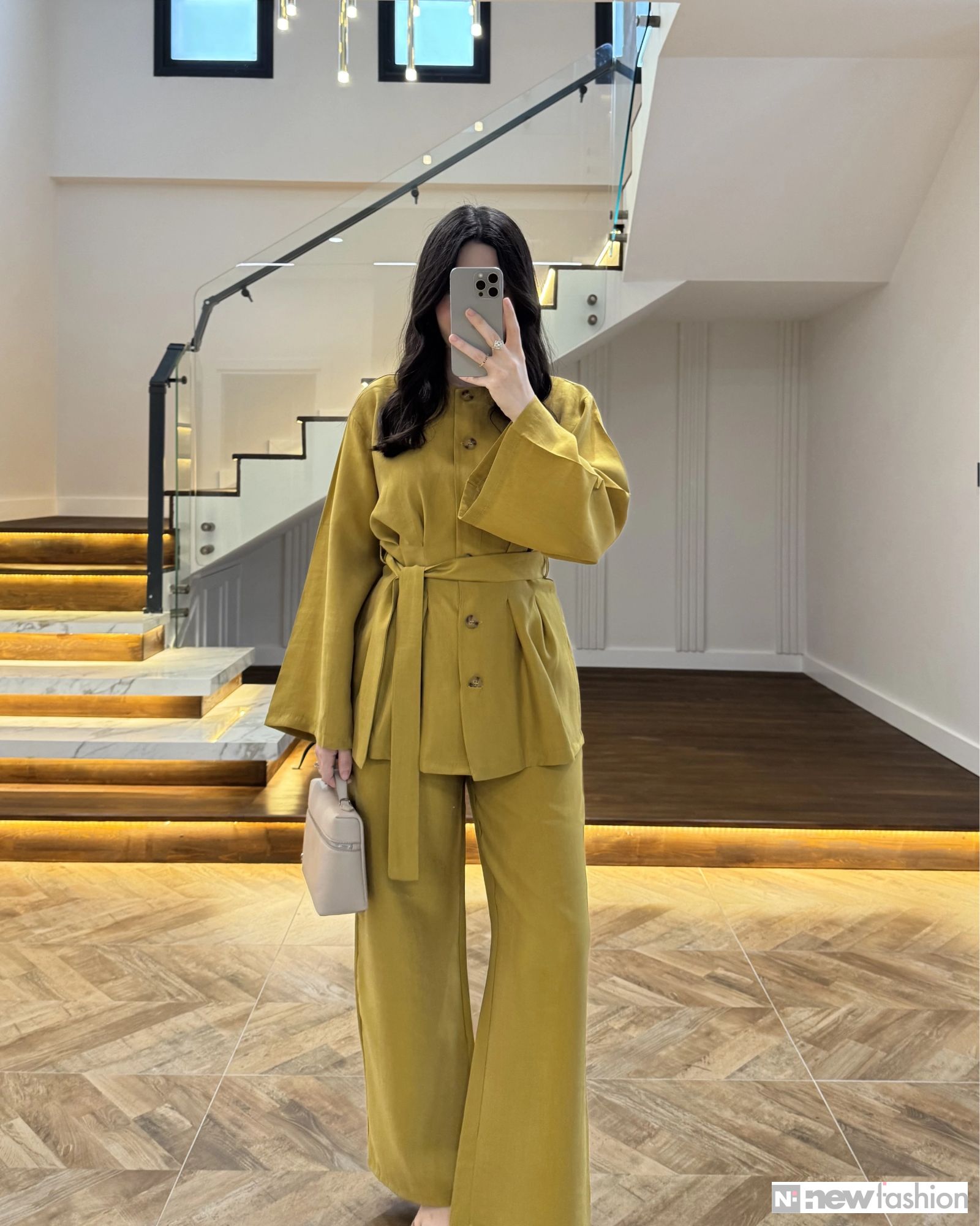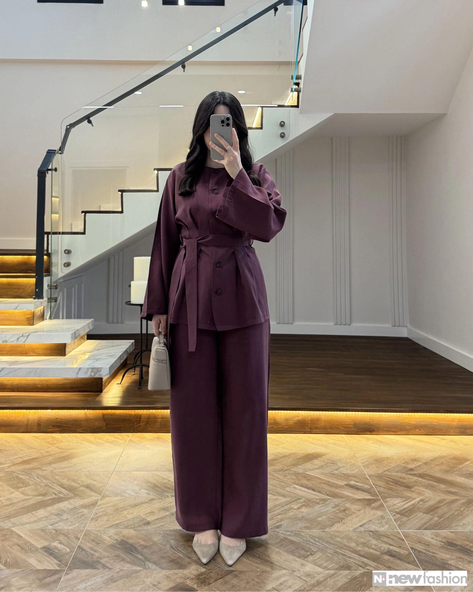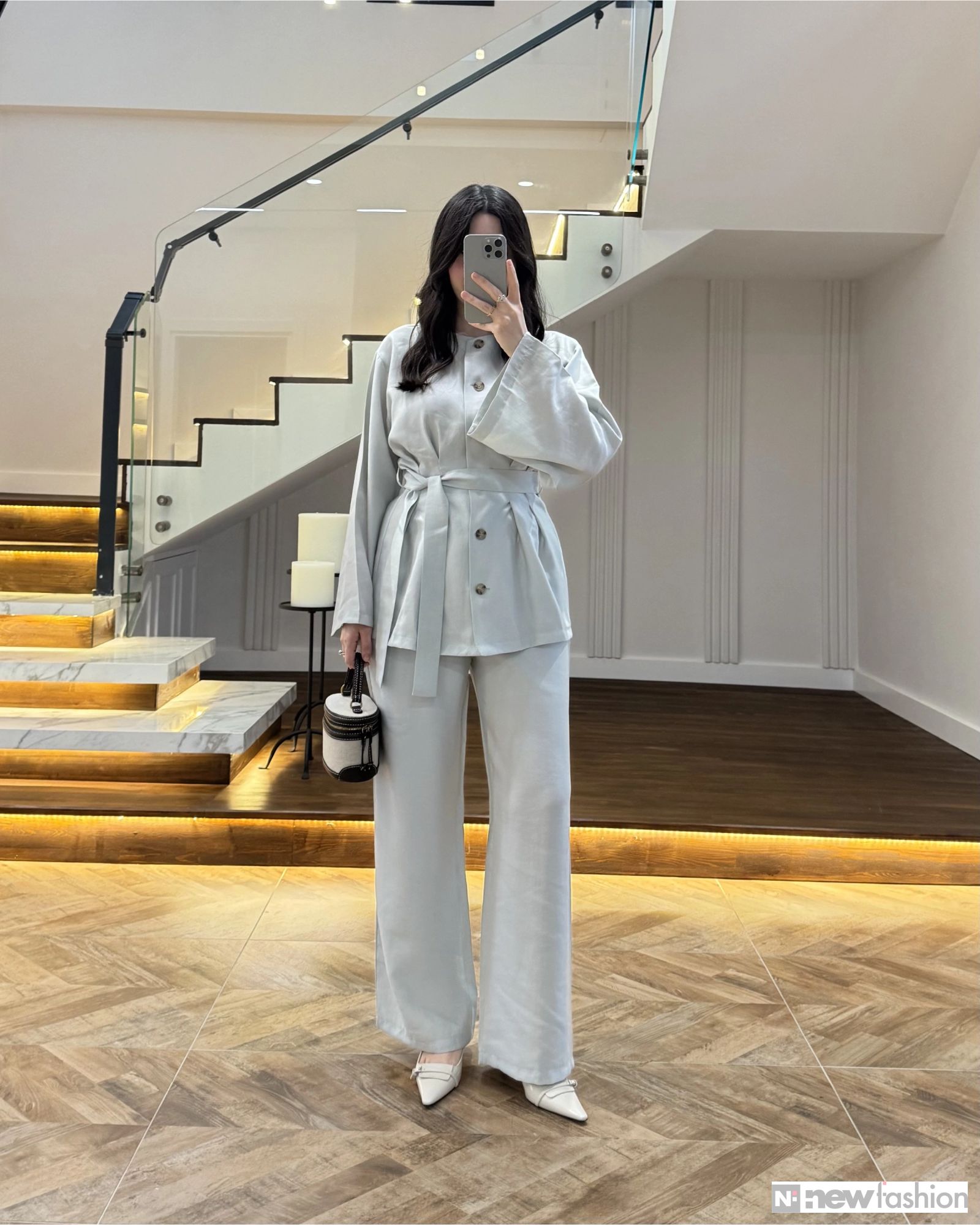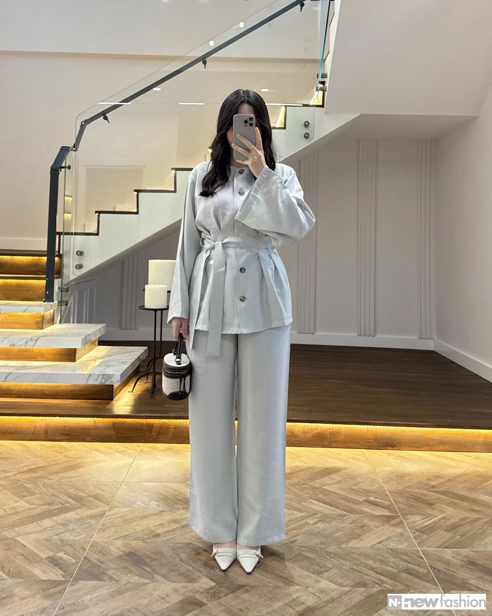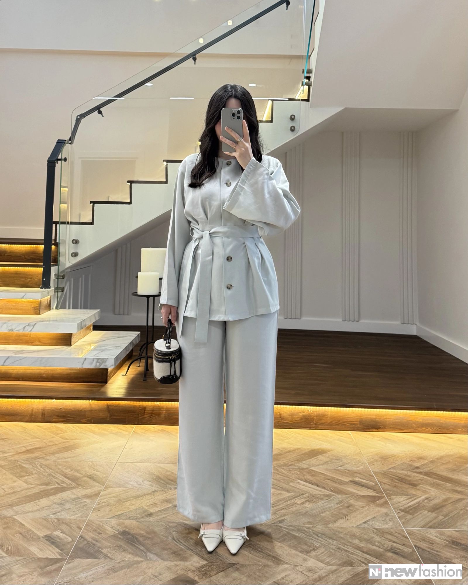 - القطعة العلوية: قميص بأزرار وأكمام واسعة وحزام أنيق لتحديد الخصر. 👚