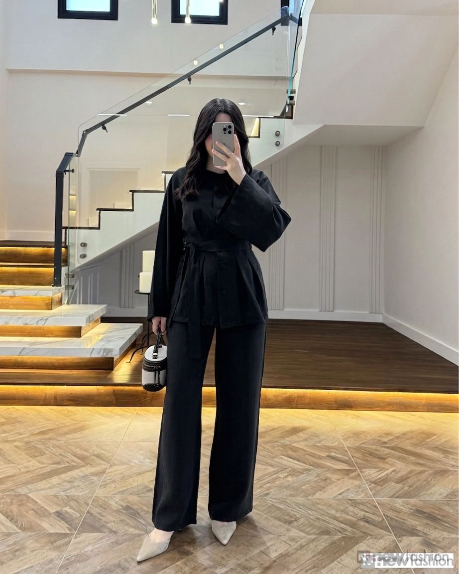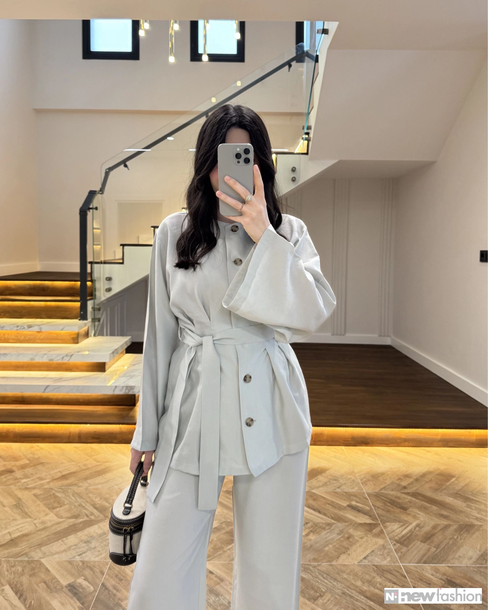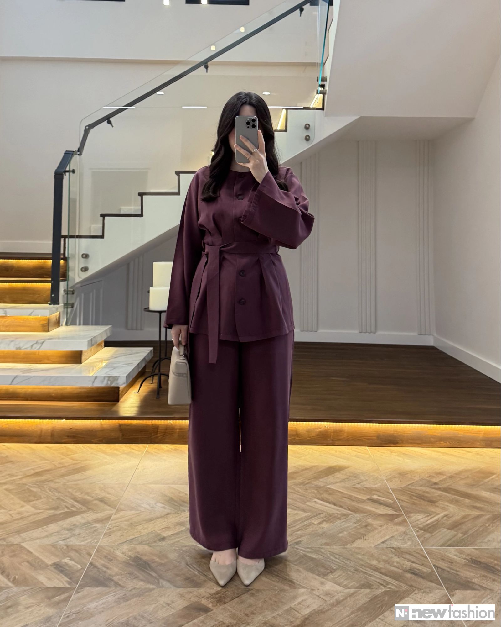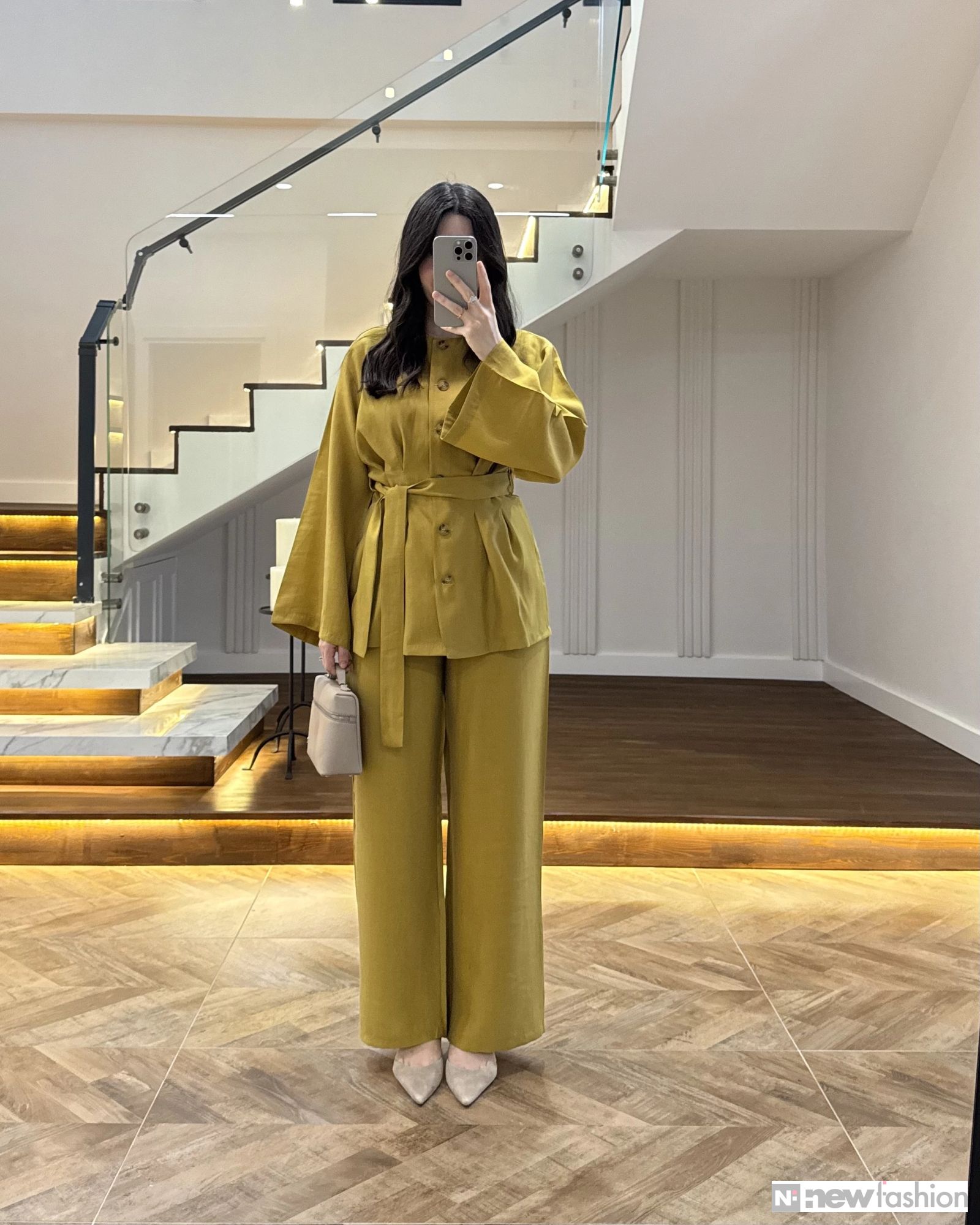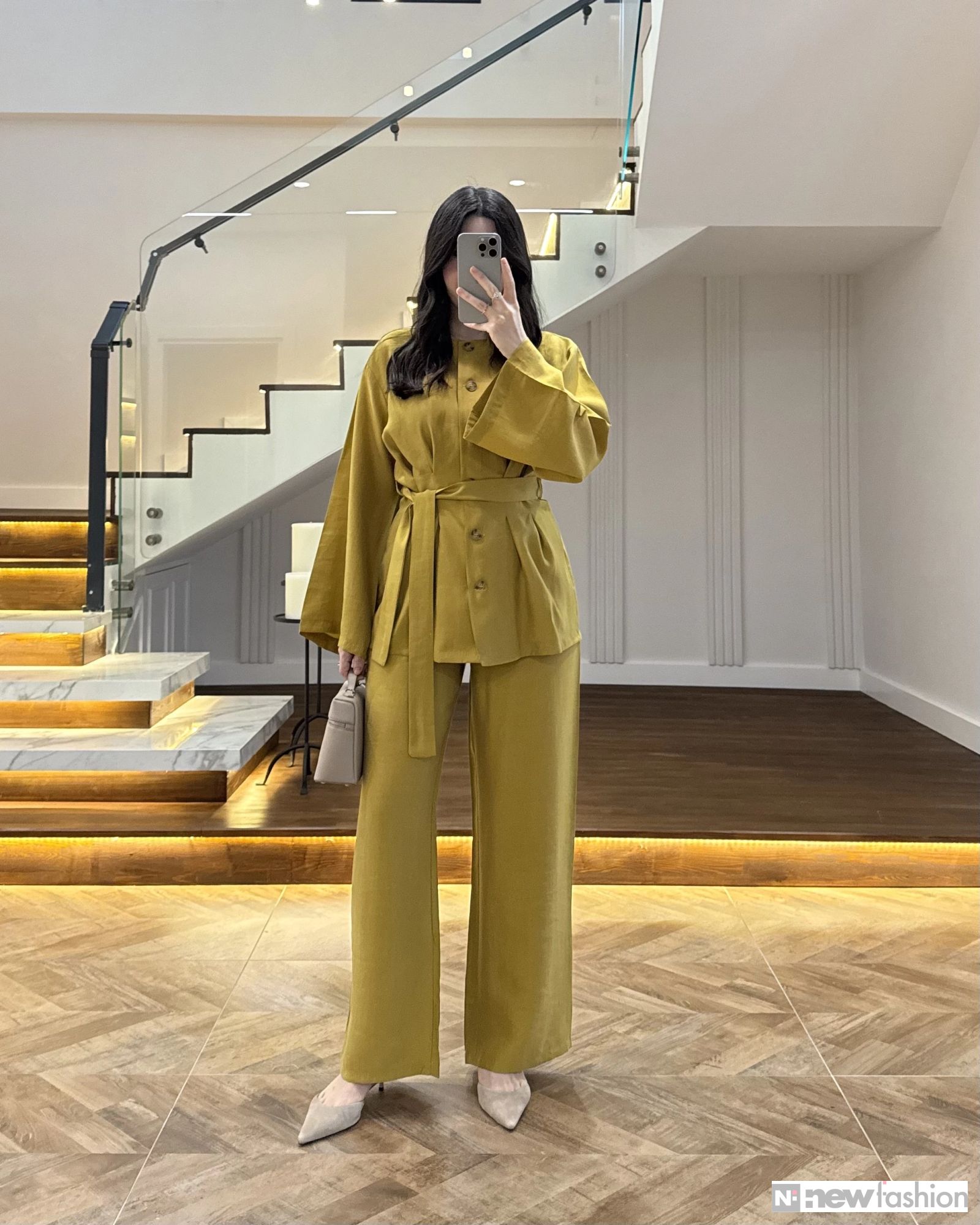 - القطعة العلوية: قميص بأزرار وأكمام واسعة وحزام أنيق لتحديد الخصر. 👚