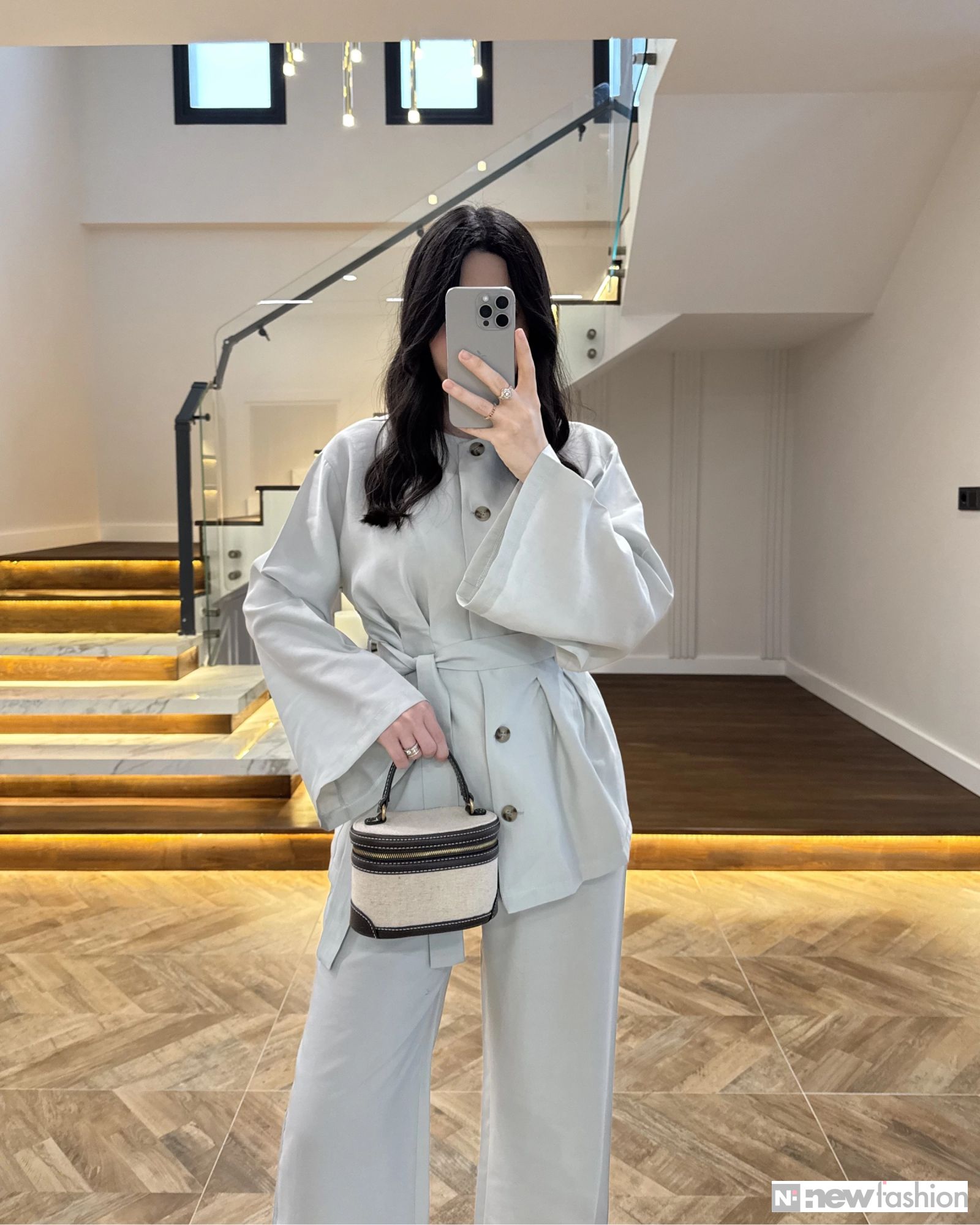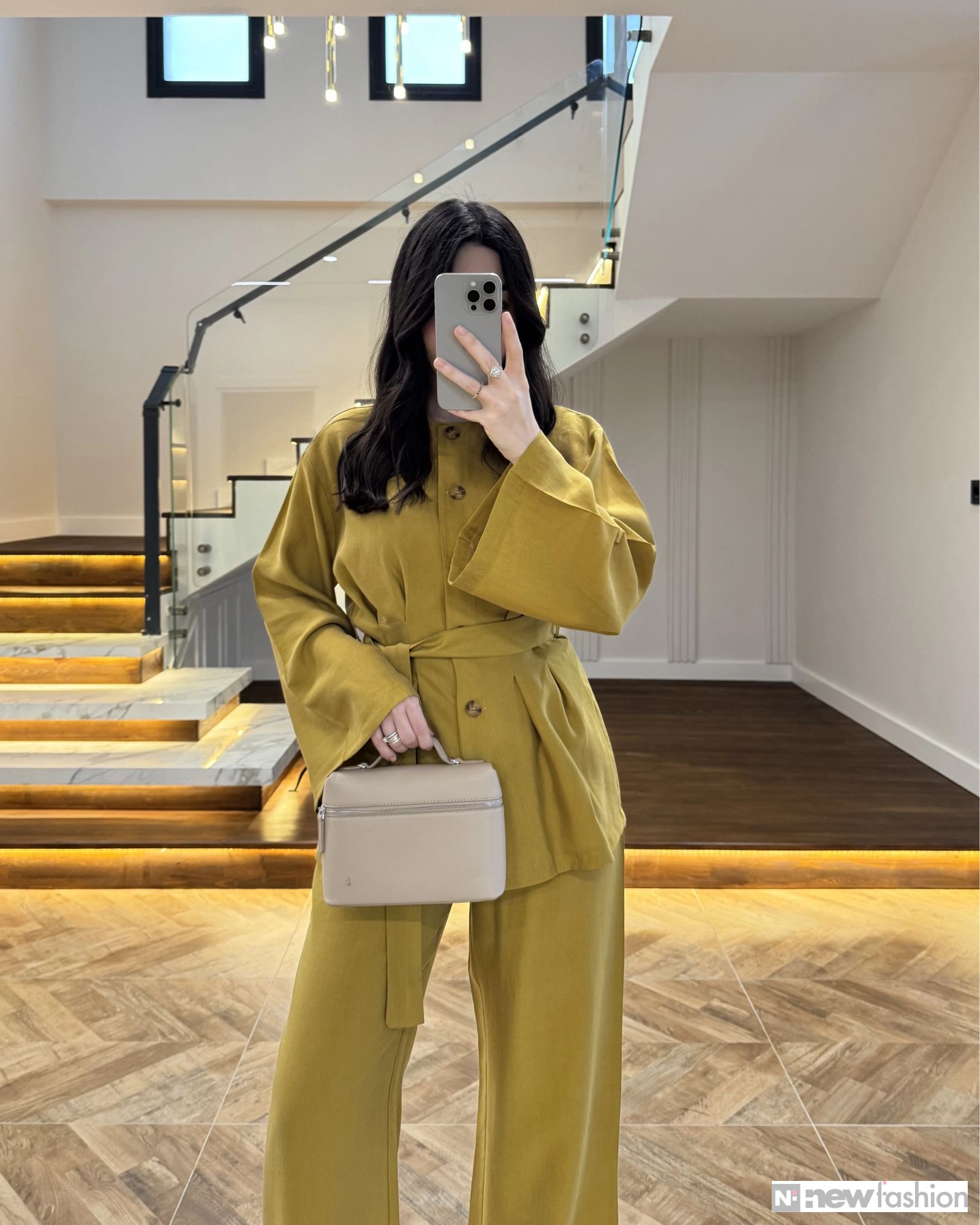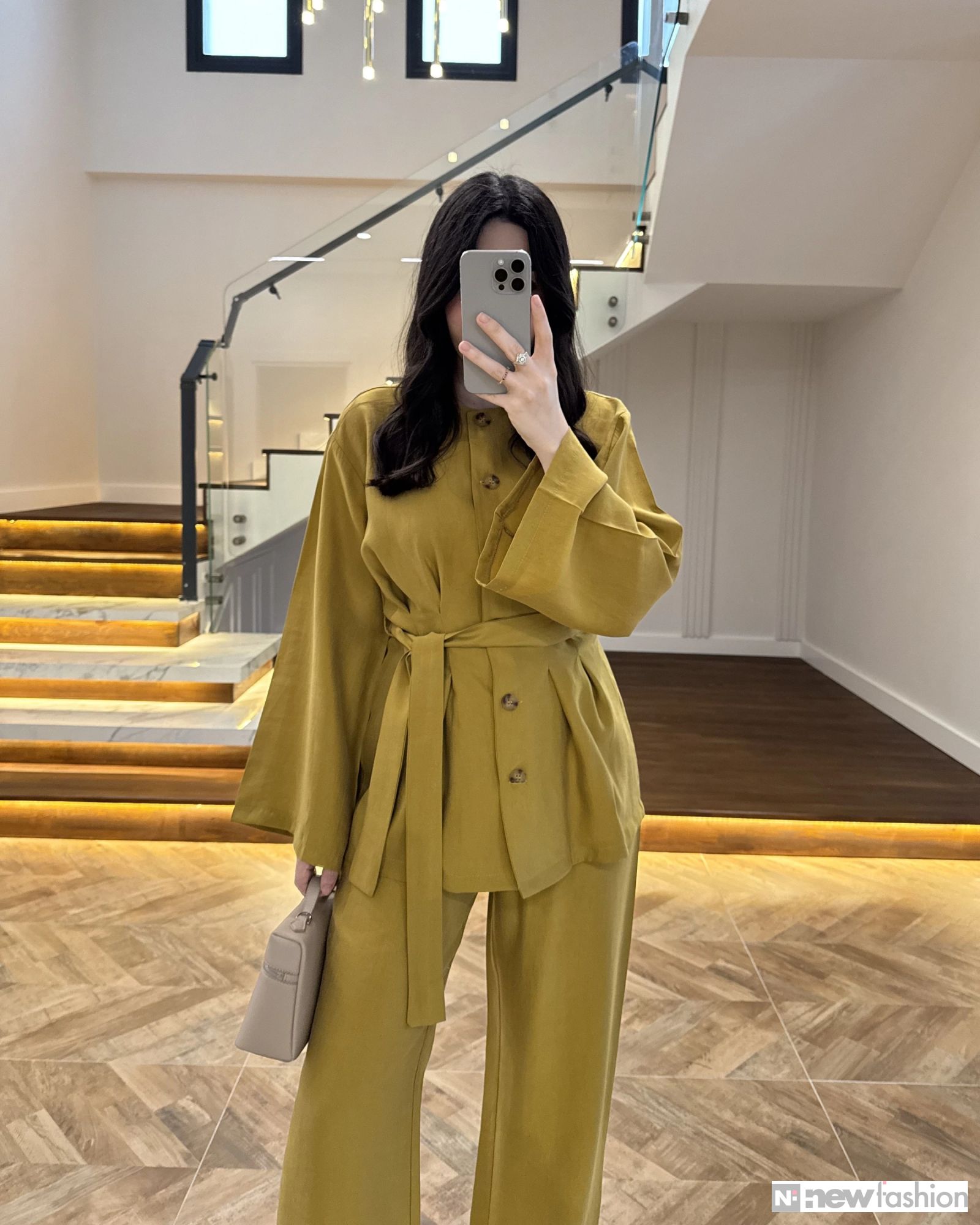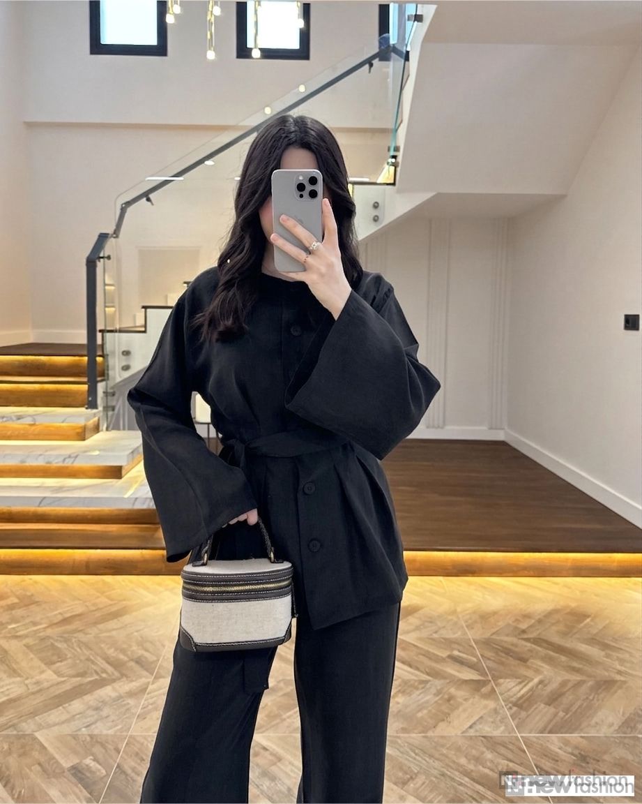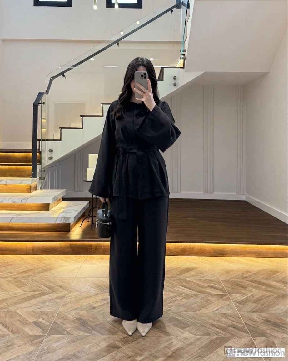 - القطعة العلوية: قميص بأزرار وأكمام واسعة وحزام أنيق لتحديد الخصر. 👚