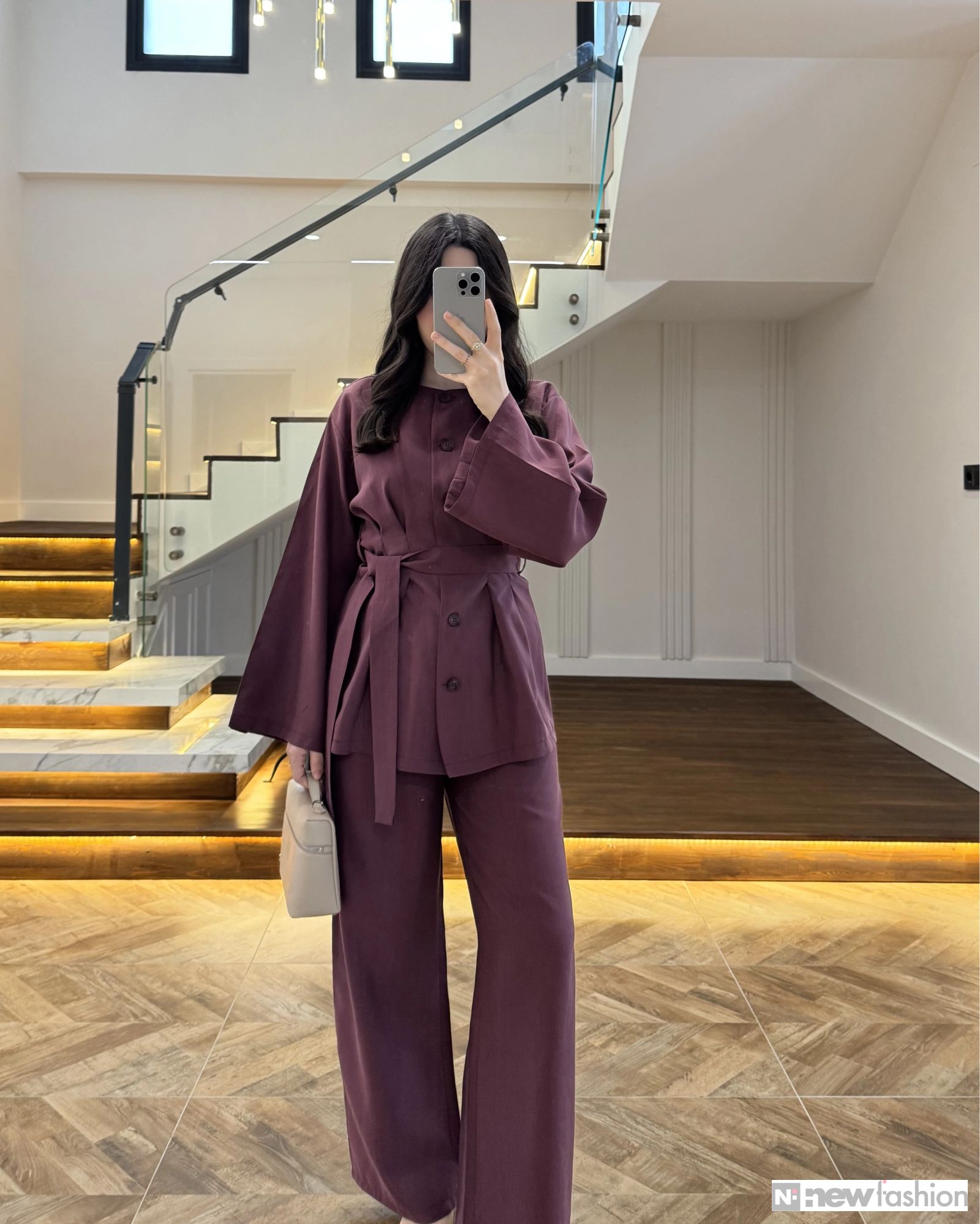 أنسومبل نسائي راقٍ من قطعتين مع حزام للخصر وأكمام واسعة لإطلالة محتشمة وعصرية